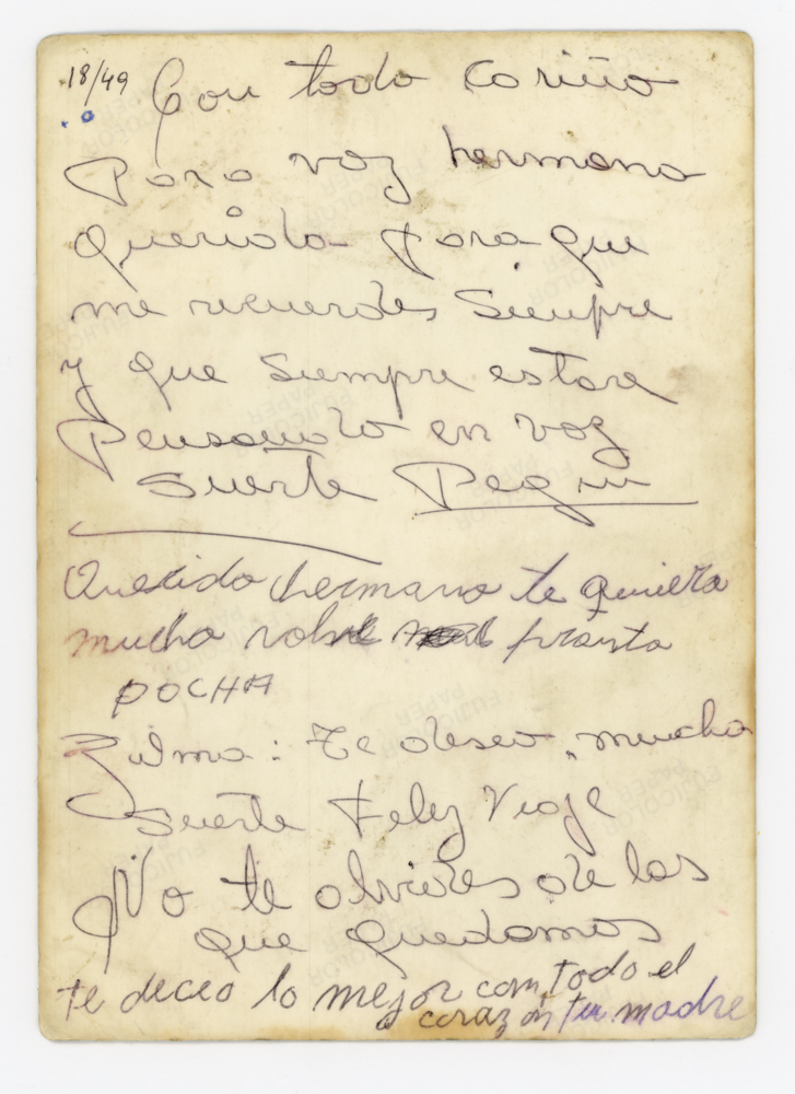 Fotografía tomada en el casamiento de Pocha Vivanco, que posteriormente le envían a Gina firmada con saludos de parte de su hermana Pegui Vivanco, Pocha, su amiga La Zulma y su madre Gabriela