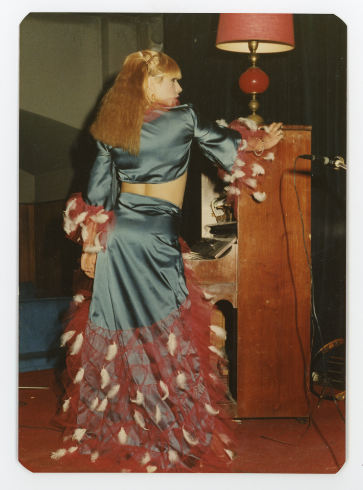 Silvia con el primer traje que se hizo para el cabaret "Las Vegas", el traje era de razo y se lo hizo Jeny Colbert, después con Mónica Sánchez Blanco pelaron gallinas y pegaron las plumas una por una. "Las Vegas" era el único cabaret registrado de la provincia en ese momento; en la época en que el cabaret estaba relacionado a lo teatral y no lo sexual. Silvia cuenta que estaba registrada como artista, lo que la salvó varias veces de que la policía la llevara